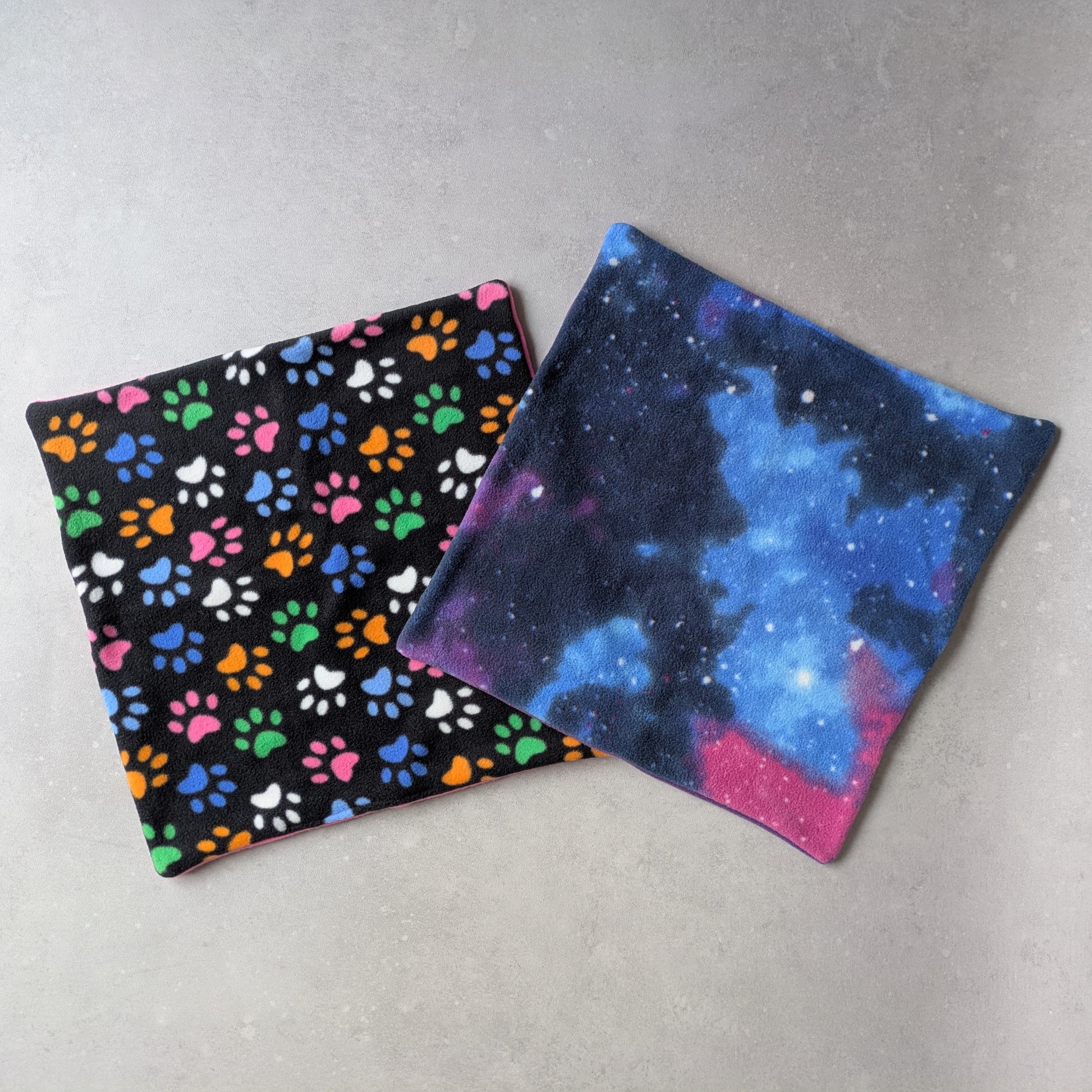 Ober- und Unterseite bestehen aus Fleece (100% Polyester), dazwischen dicker Molton (100% Baumwolle).